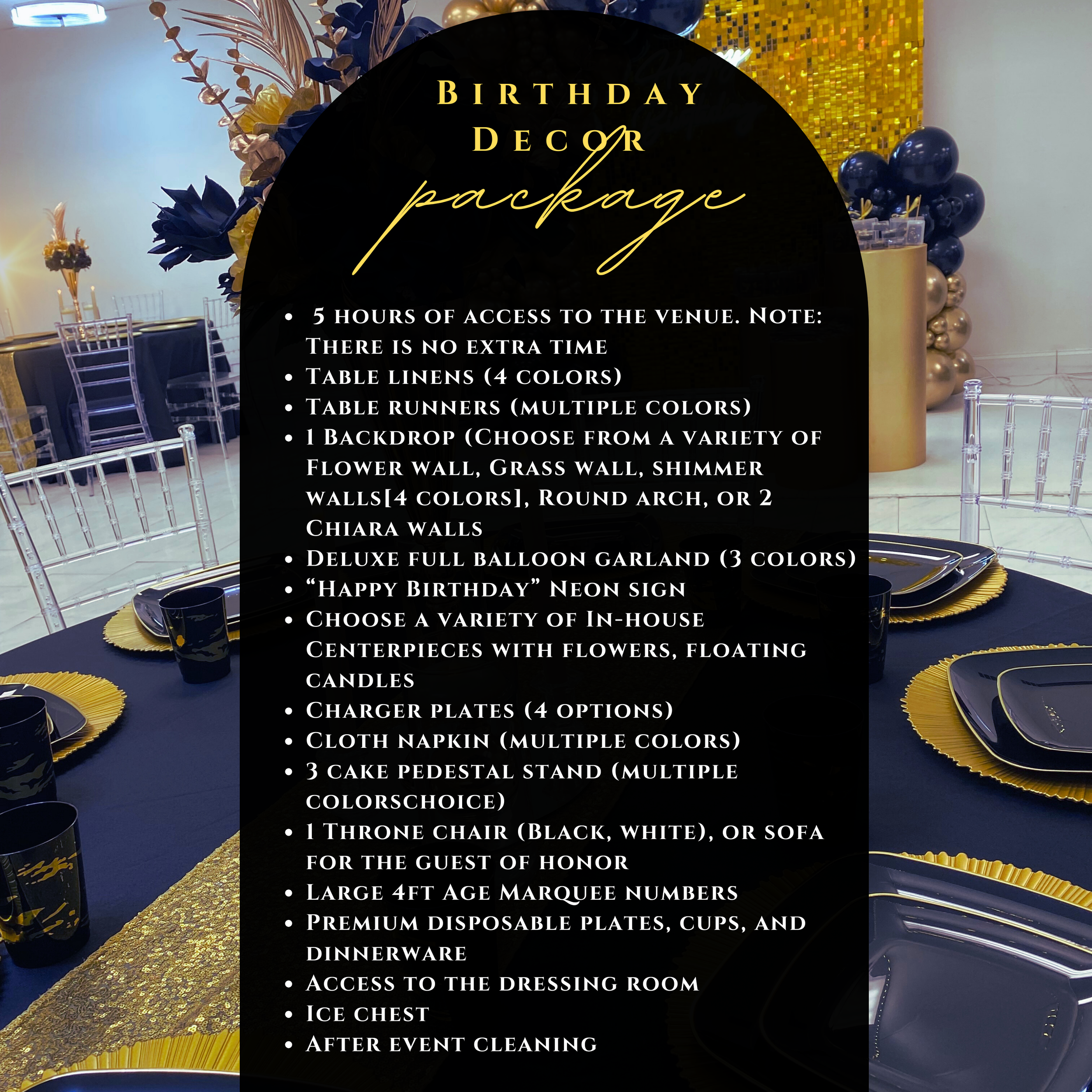 This package is an ideal choice for clients looking to celebrate their birthday and make memories with a fully decorated venue