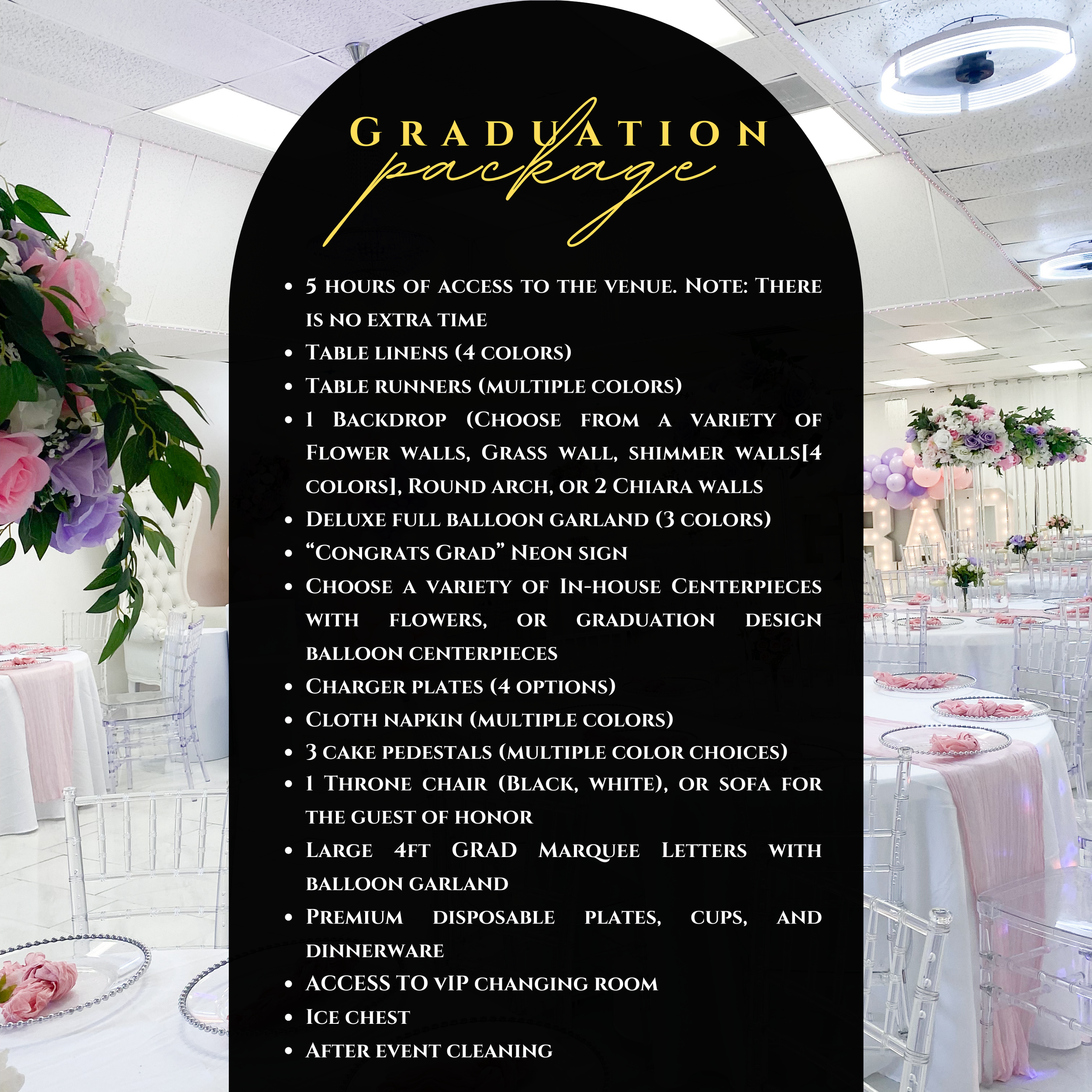 This package is an ideal choice for clients looking to celebrate their graduation and make memories with a fully decorated venue